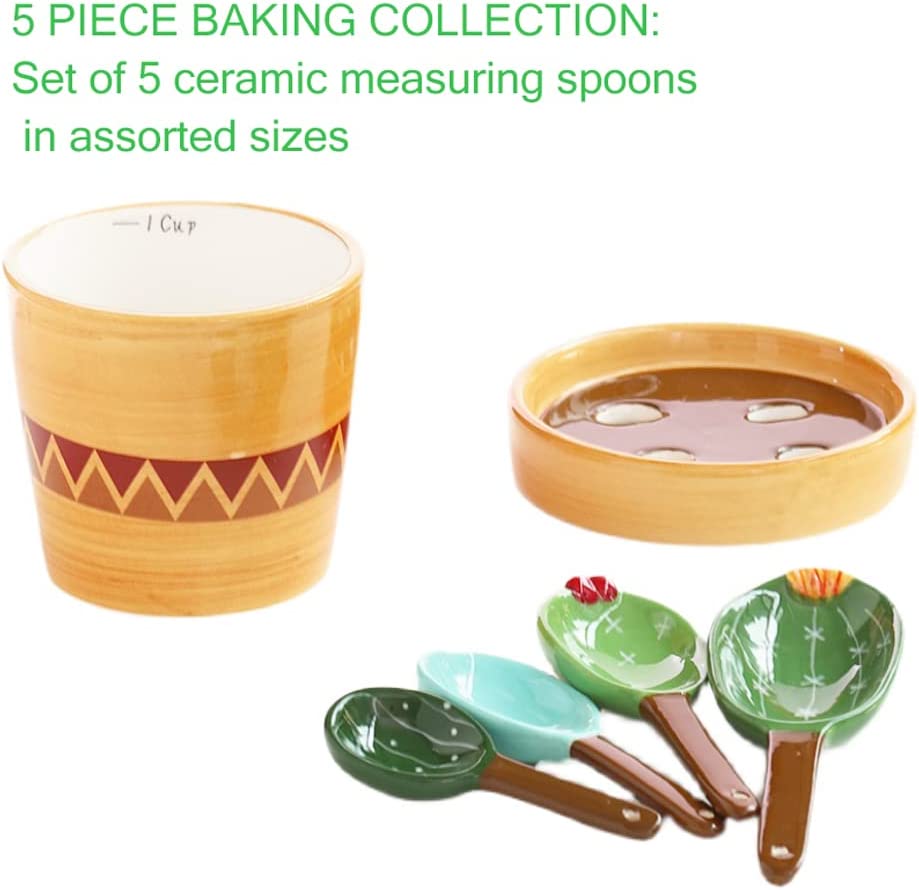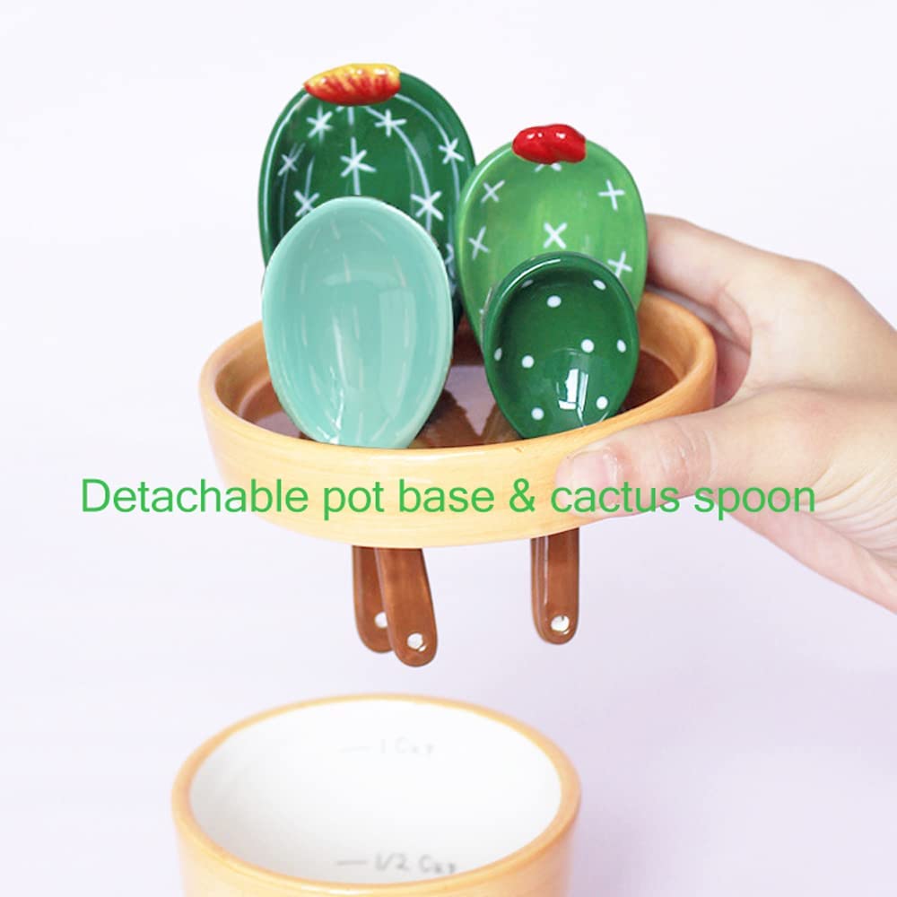 Ceramic Cactus Measuring Spoons set in pot organizer, 5 Pieces cute measuring cups and spoons set for kitchen dry wet measuring Liquid food salt and sugar kawaii Small Cacti Spoon with base cup