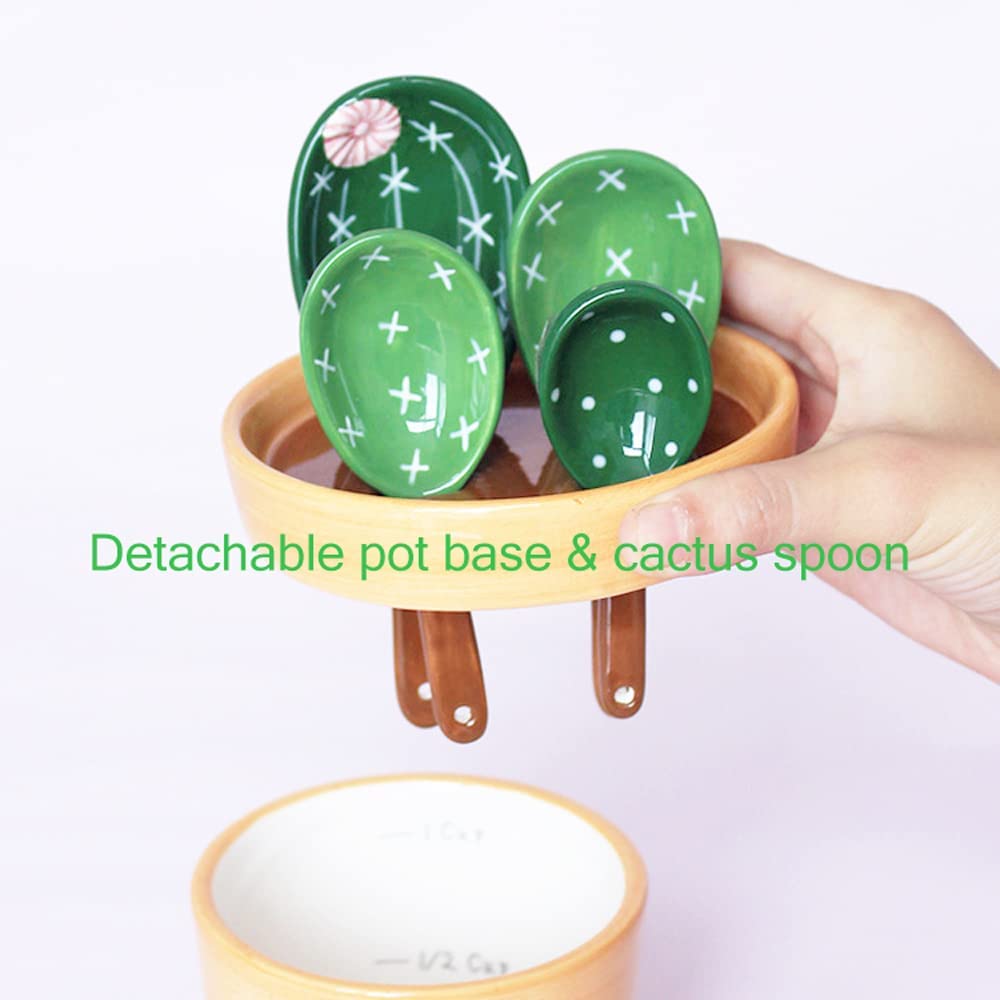 Ceramic Cactus Measuring Spoons set in pot organizer, 5 Pieces cute measuring cups and spoons set for kitchen dry wet measuring Liquid food salt and sugar kawaii Small Cacti Spoon with base cup green